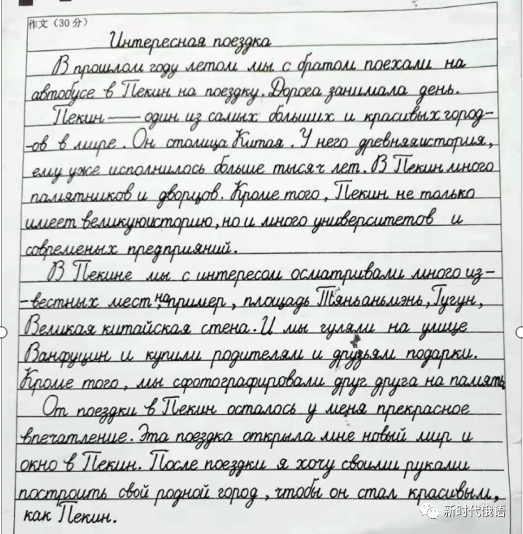 2)俄语字母的规范书写。俄语字母和单词的书写是决定高考时一篇作文是四档还是五档的关键因素,一篇书写规范工整的作文会直接提升阅卷老师的好感,提高作文的档次分。因此,老师一定要在入门学习时教授学生规范书写,培养他们良好的书写习惯,并持之以恒地练习。