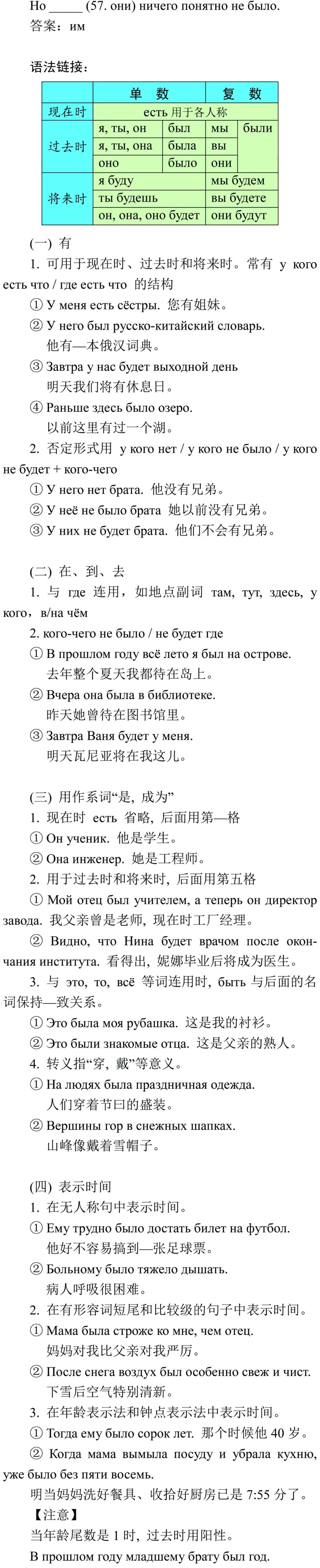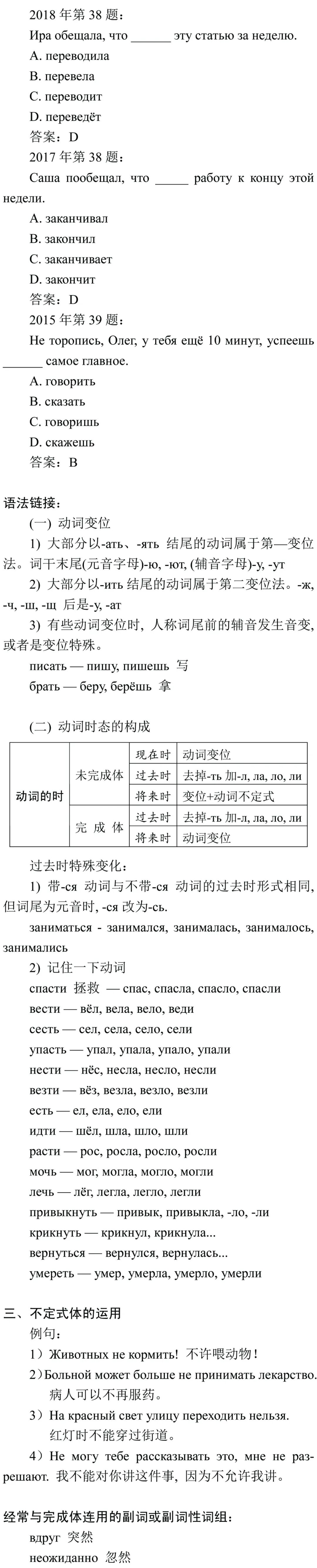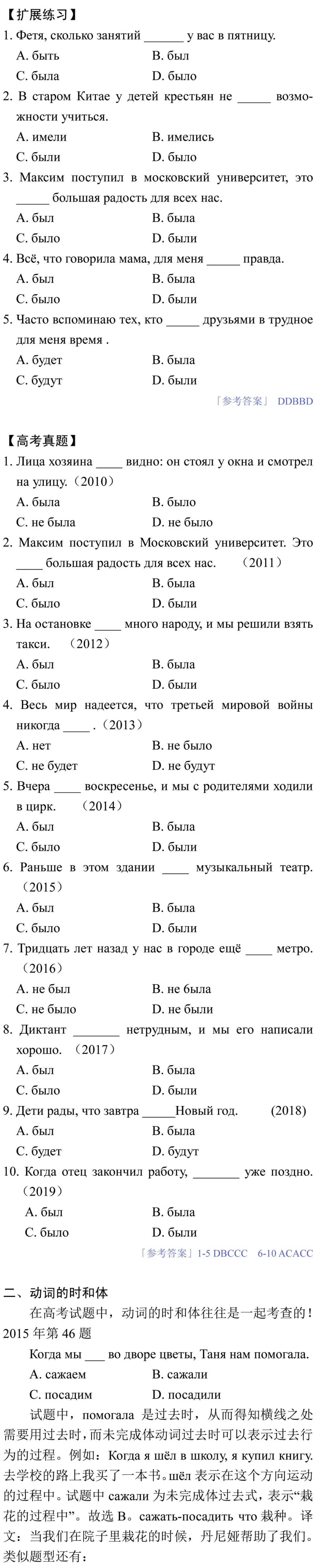 从2010年到2020年这11年的高考试题中可以看出,动词在第二部分俄语知识运用30道题中每年都会考查10道题左右,分别是:быть的用法(36题),动词时与体,带ся动词,命令式等,是俄语语法中最重要的一部分,下面我们逐一分析。