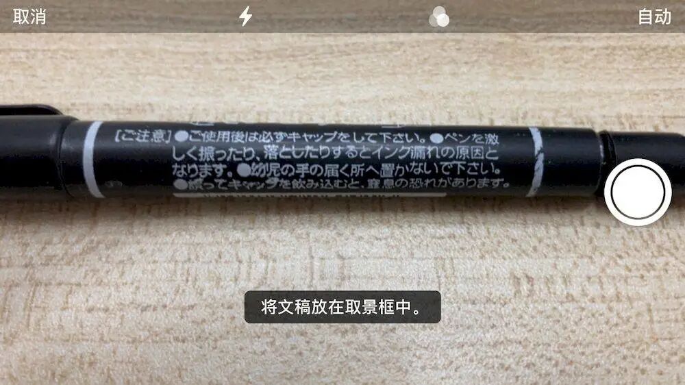 以我桌上的一支日产油性笔为例,首先对着文字进行拍照,然后手动框选文字范围,再进行解析。从结果来看,App 没能将方括号正确识别,而且当一句话换行时就会识别成两句。除此之外,还是差强人意的。
