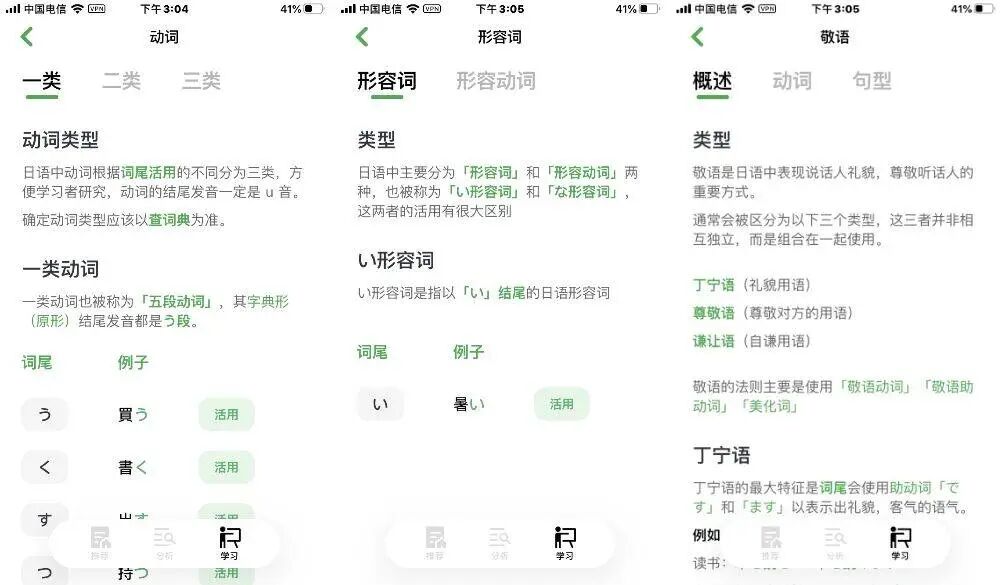 除了「互动课堂」,《捧读》还对动词的活用法则、形容词的活用法则和敬语的组合原理与规则进行了整理,方便初学者快速对动词或形容词的用法有个全面参考。