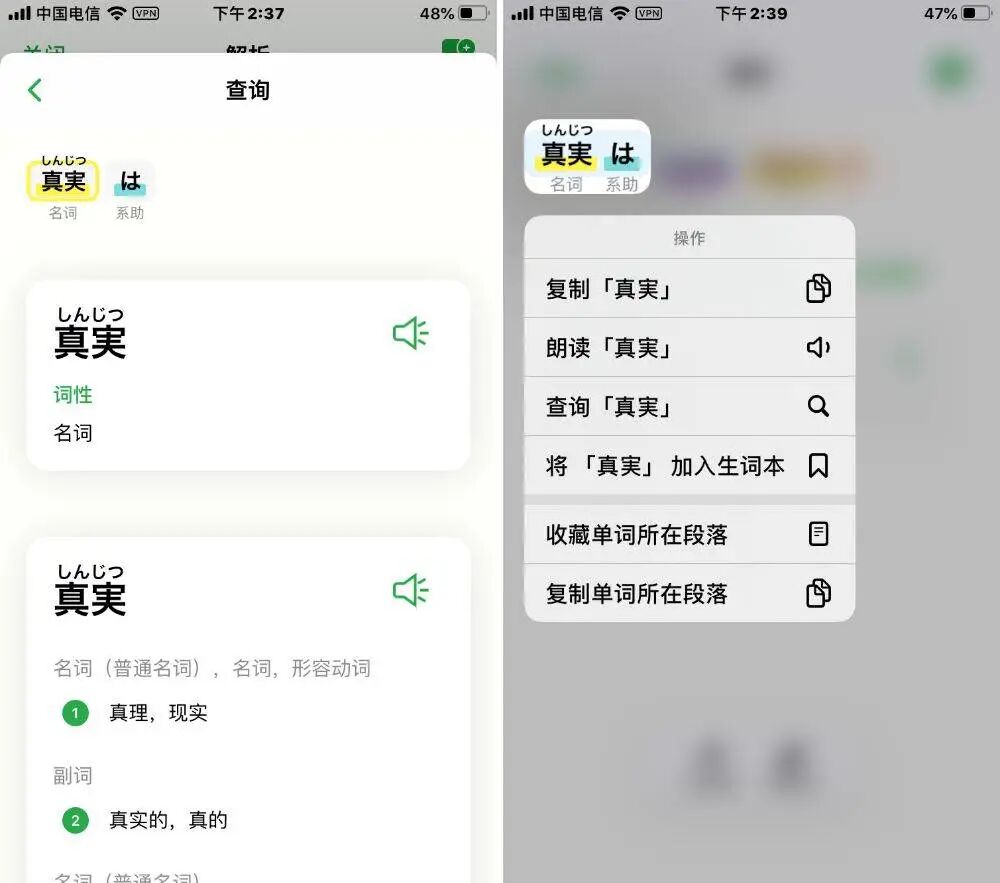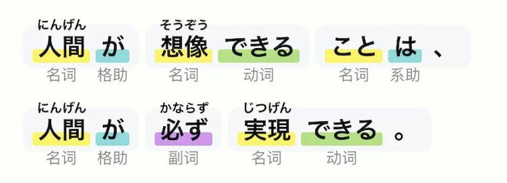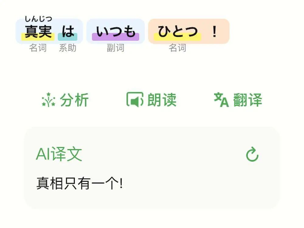 直接输入举一句简单的日语「真実はいつもひとつ!」,这是柯南的名台词「真相永远只有一个!」,通过 App 解析后就能自动断成「真実/は/いつも/ひとつ/」,其中「真実」和「ひとつ」是名词,而「は」是助词,「いつも」是副词,不同词性通过不同颜色以示区分。