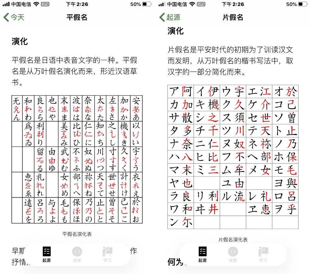 作为一名初学者,在学习 50 音时,从熟悉的汉字入手,能够更快掌握假名的构造。看见一个假名,从汉字起源联想到发音,然后慢慢过渡到不用联想就能直接读出来。