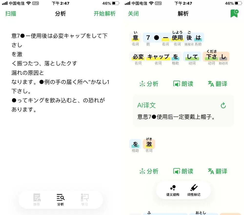 解析后的句子还能使用「分析」、「朗读」和「翻译」功能。「分析」可以将句子转换为简单的树形结构,方便分析日语句子表达特点、语序以及修饰习惯。「朗读」和「翻译」自然就是对整句句子进行朗读和翻译了。拍照扫描日常生活中其实我们经常会遇到日本的产品,比如化妆品、游戏、零食等,这时候如果想读懂产品上的说明,就可以使用《捧读》进行拍照,然后对日语句子进行解析。