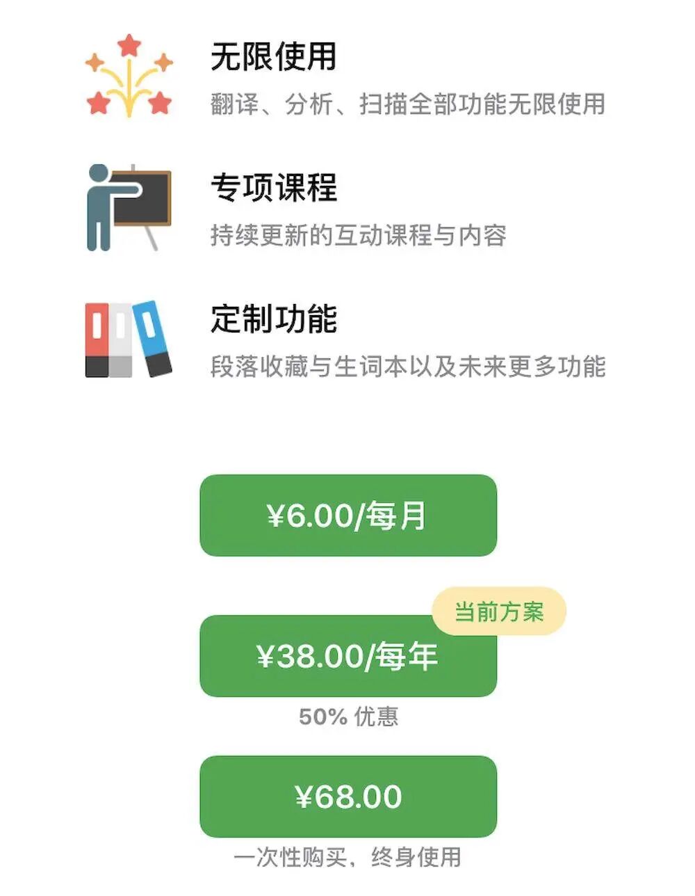 目前,推荐内容更新了四周,每周 5 篇文章,而免费用户只能阅读第一周内容,如果想要继续读下去,需要订购 Pro 版,¥6/月或 ¥38/年 ,当然也可 ¥68 买断,随着后期更新的内容越来越多,买断的价格也可能逐渐上调。